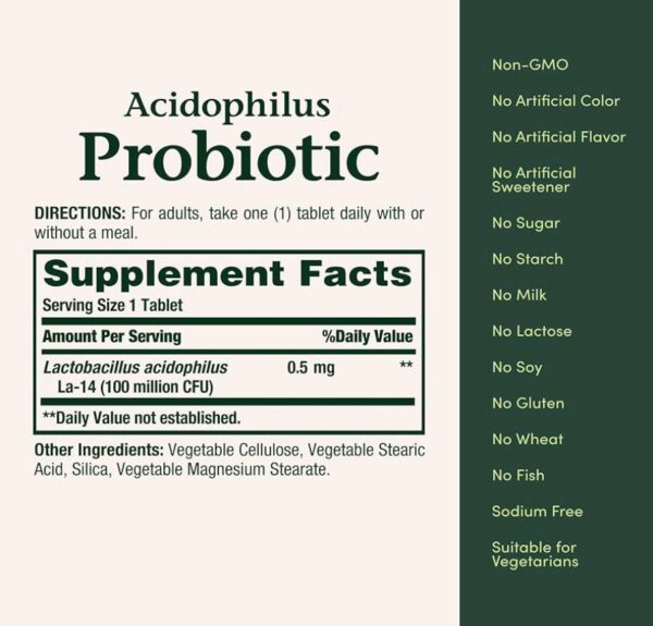 Cada tableta contiene 100 millones de organismos vivos de Lactobacillus Acidophilus, uno de los probióticos más estudiados y recomendados a nivel mundial.